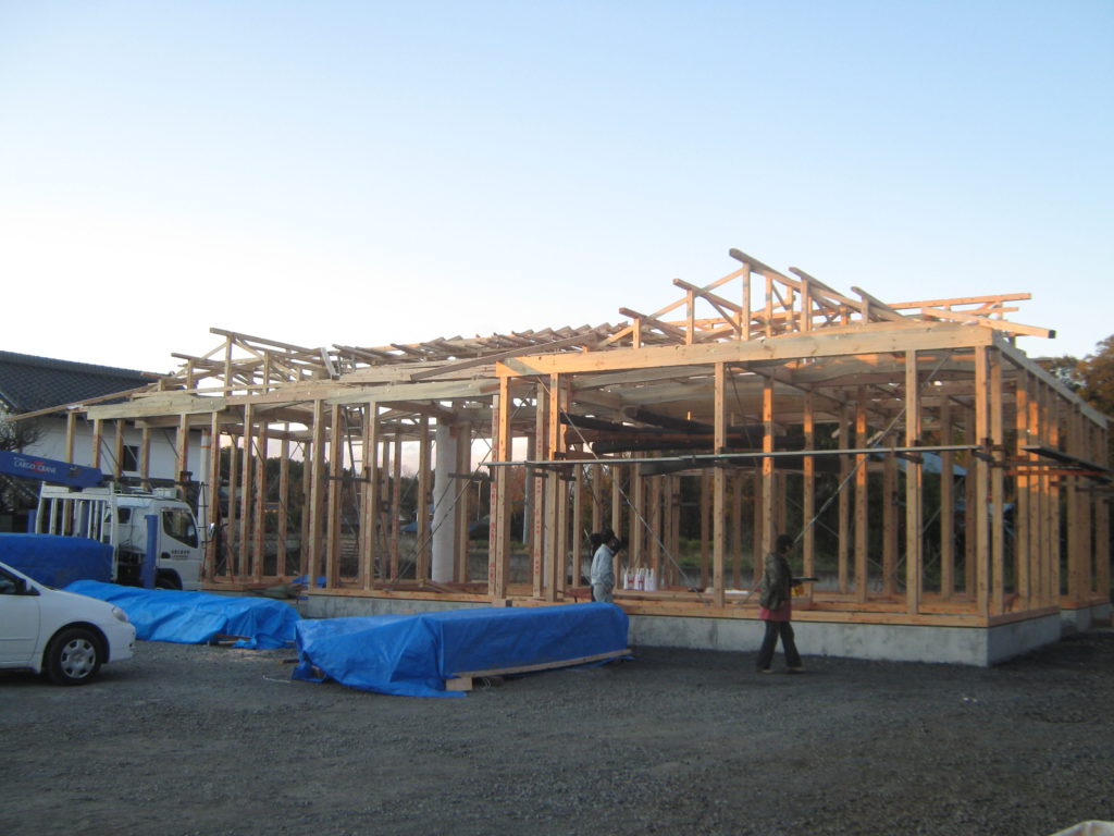 旧母屋の古材の梁を,リビングの天井部分に今回再利用!! 篠原様はイメージが分からなかったそうですが,建て方工事が進むにつれ古材の梁が組まれてくると,